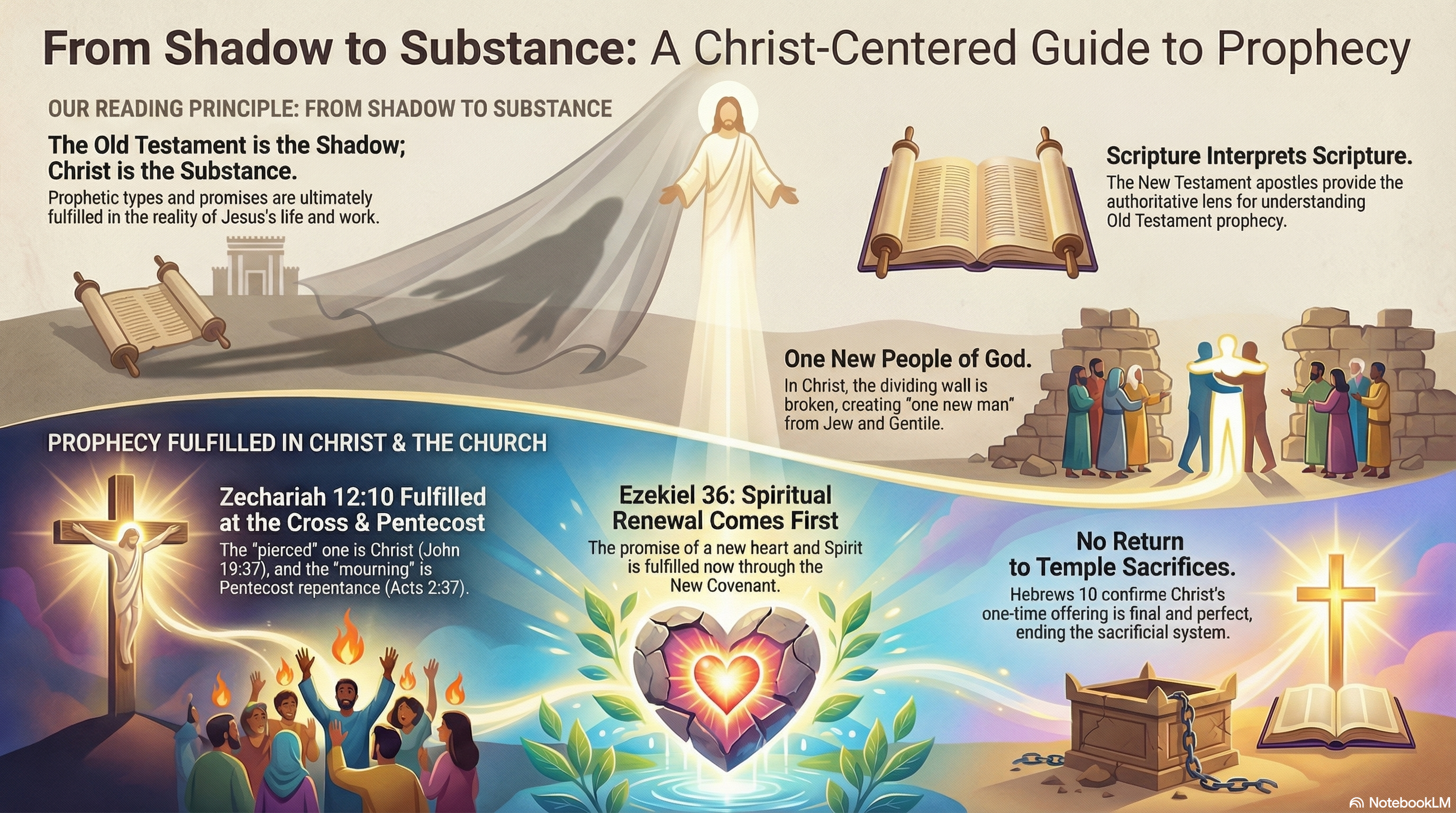 Scripture interprets Scripture. Prophecy moves from **shadow to substance** in Christ; the New Covenant reveals what the Old anticipated. Therefore, promises to Israel **reach their fulfillment in Christ and His church**, the “one new man” of Jew and Gentile together (Ephesians 2:14–16). Some popular “literal” readings *add* contexts Scripture does not, especially around **Zechariah 12–14** and **Ezekiel 36–37**. Let’s read these passages by the apostolic rule—with Christ at the center, the KJV text in hand, and charity toward our neighbors.