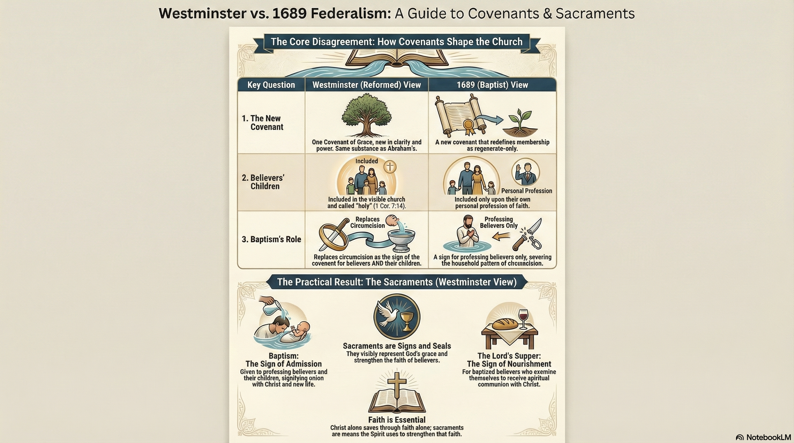 If you’re weighing classic Reformed covenant theology (Westminster) against Baptist federalism (1689), here are three questions that clarify the differences. Here we unpack each one and include the full King James text of the key passages so you can test the logic yourself—then we add a practical guide to the sacraments: **Baptism** and **the Lord’s Supper**.