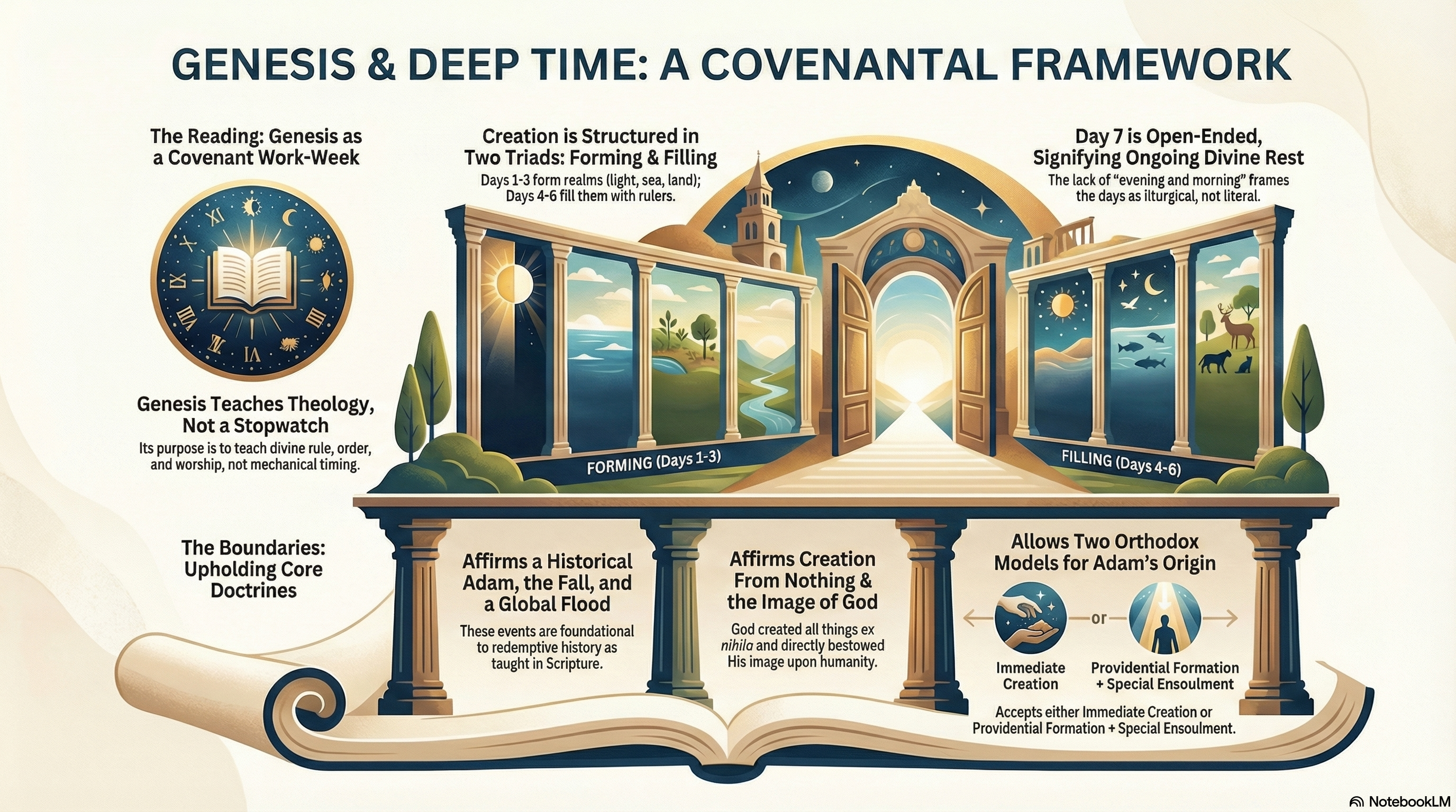The **analogical / framework** interpretation, read through a **Reformed Covenant** lens, is a **robust and confessional** way to affirm everything Genesis teaches **and** to receive what the heavens and earth describe about deep time. This is **exegesis first**, then **synthesis**—Scripture and nature speaking in harmony, to the glory of the one Creator and Redeemer.