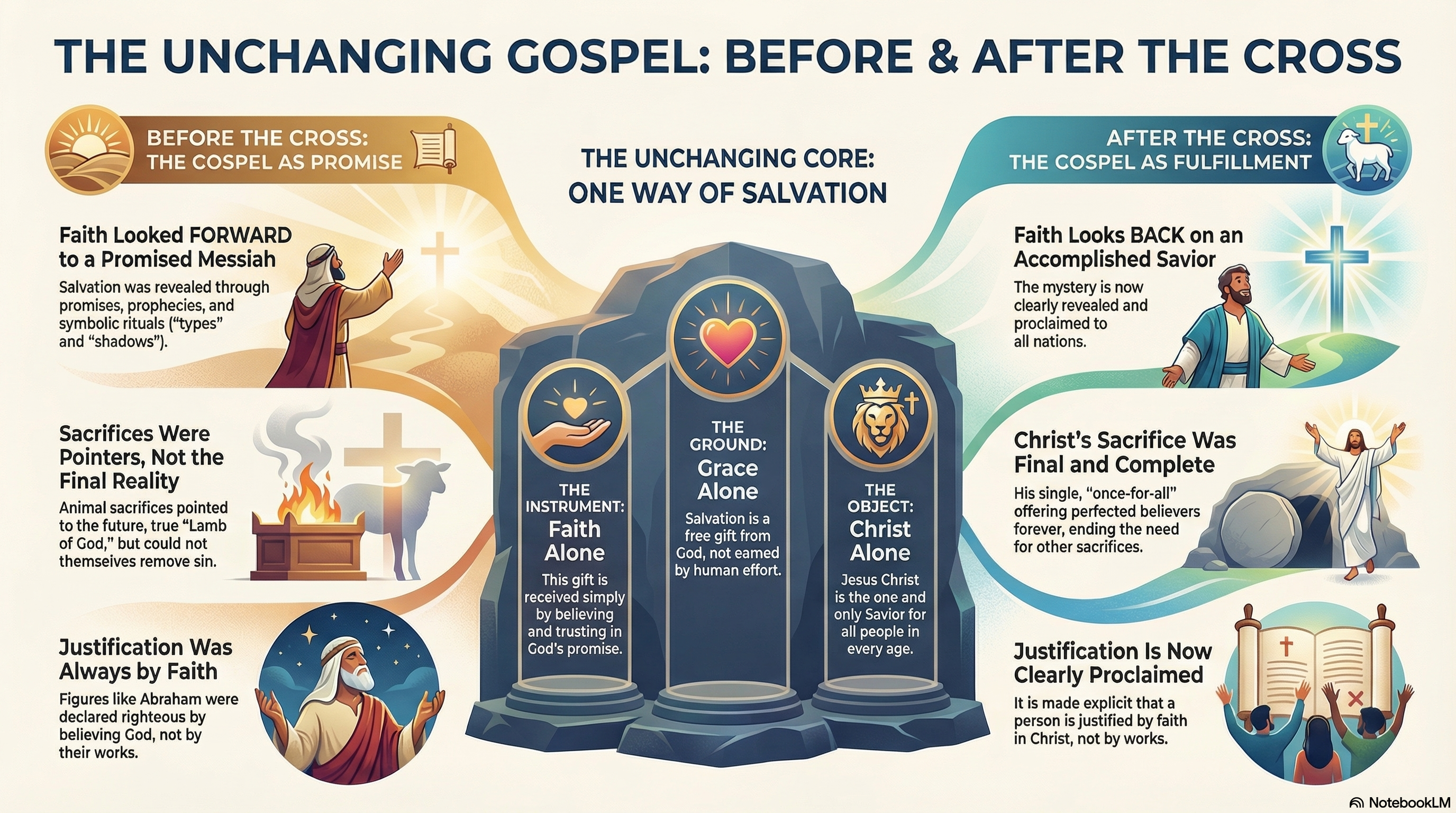 Scripture declares that God saves sinners **by grace alone, through faith alone, in Jesus Christ alone**, without alteration across redemptive history. Before the incarnation, faith looked to the **Messiah promised**; after His life, death, and resurrection, faith rests on the **Messiah accomplished**—the same Christ more clearly revealed: “Jesus Christ the same yesterday, and to day, and for ever.” (Hebrews 13:8) “For unto us was the gospel preached, as well as unto them…” (Hebrews 4:2) By the apostolic hermeneutic, this unity of salvation reflects the one covenant of grace diversely administered.